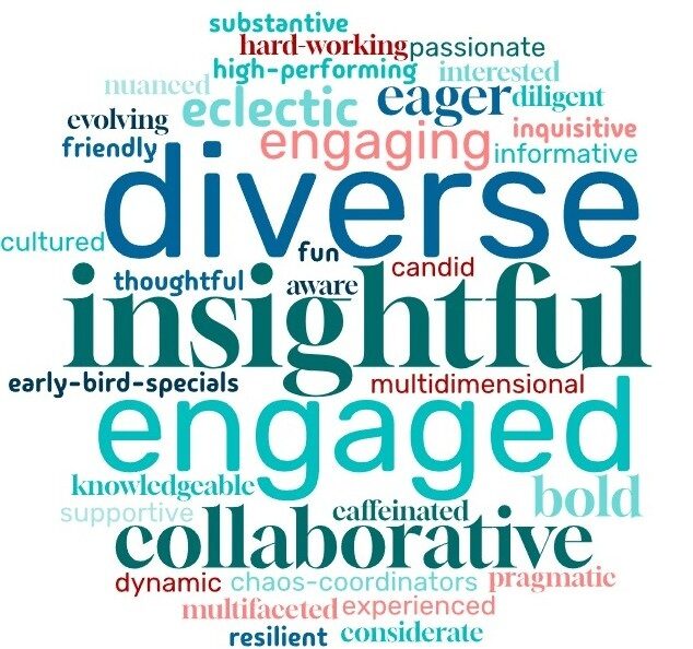 Another first for Cardinal was asking her students to describe themselves as a cohort. Their collective self-assessment reads like the world’s most productive brunch reservation: diverse, multidimensional, inquisitive, and substantive …with a side of chaos-coordinators, early-bird specials, and bottomless caffeine.